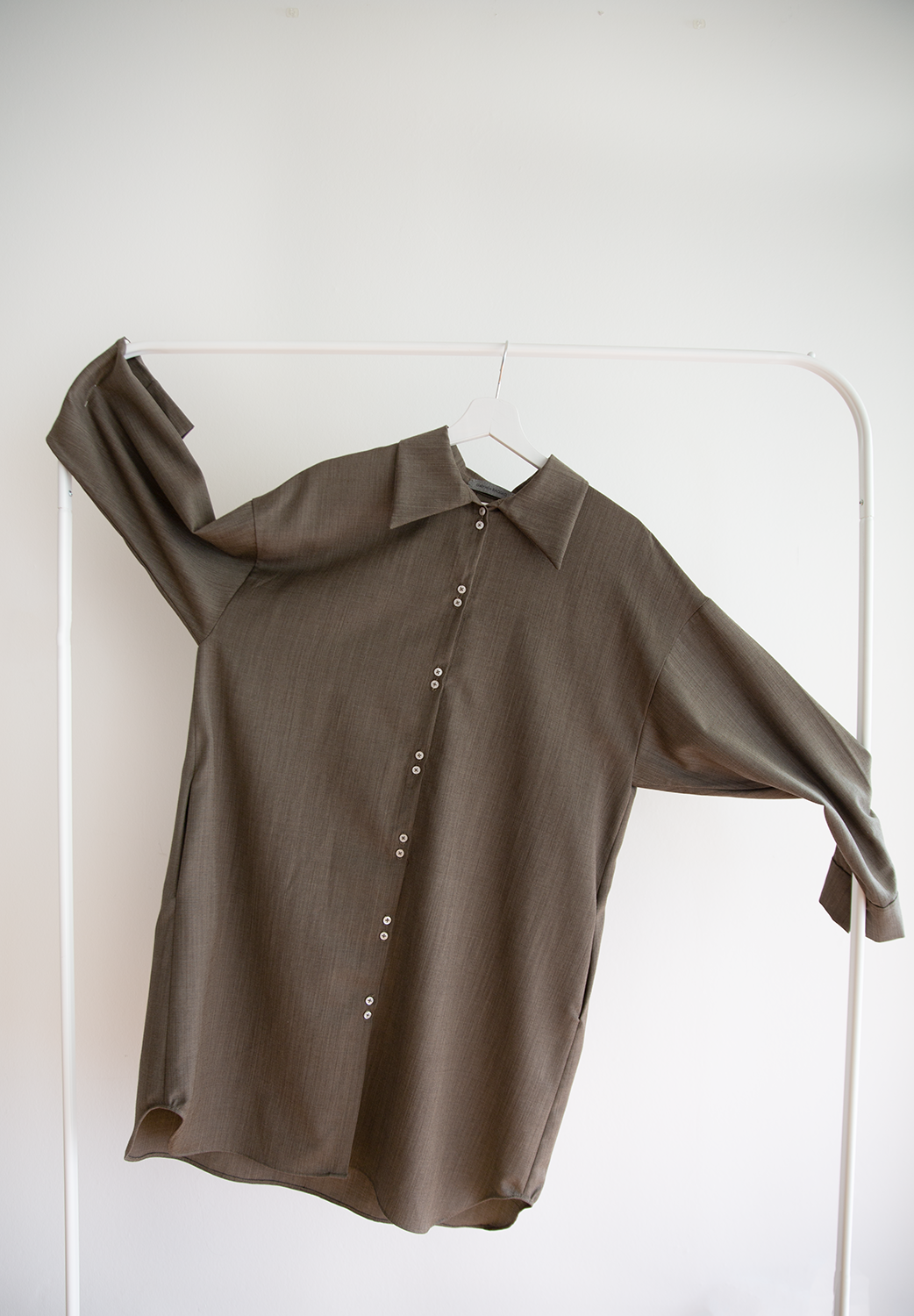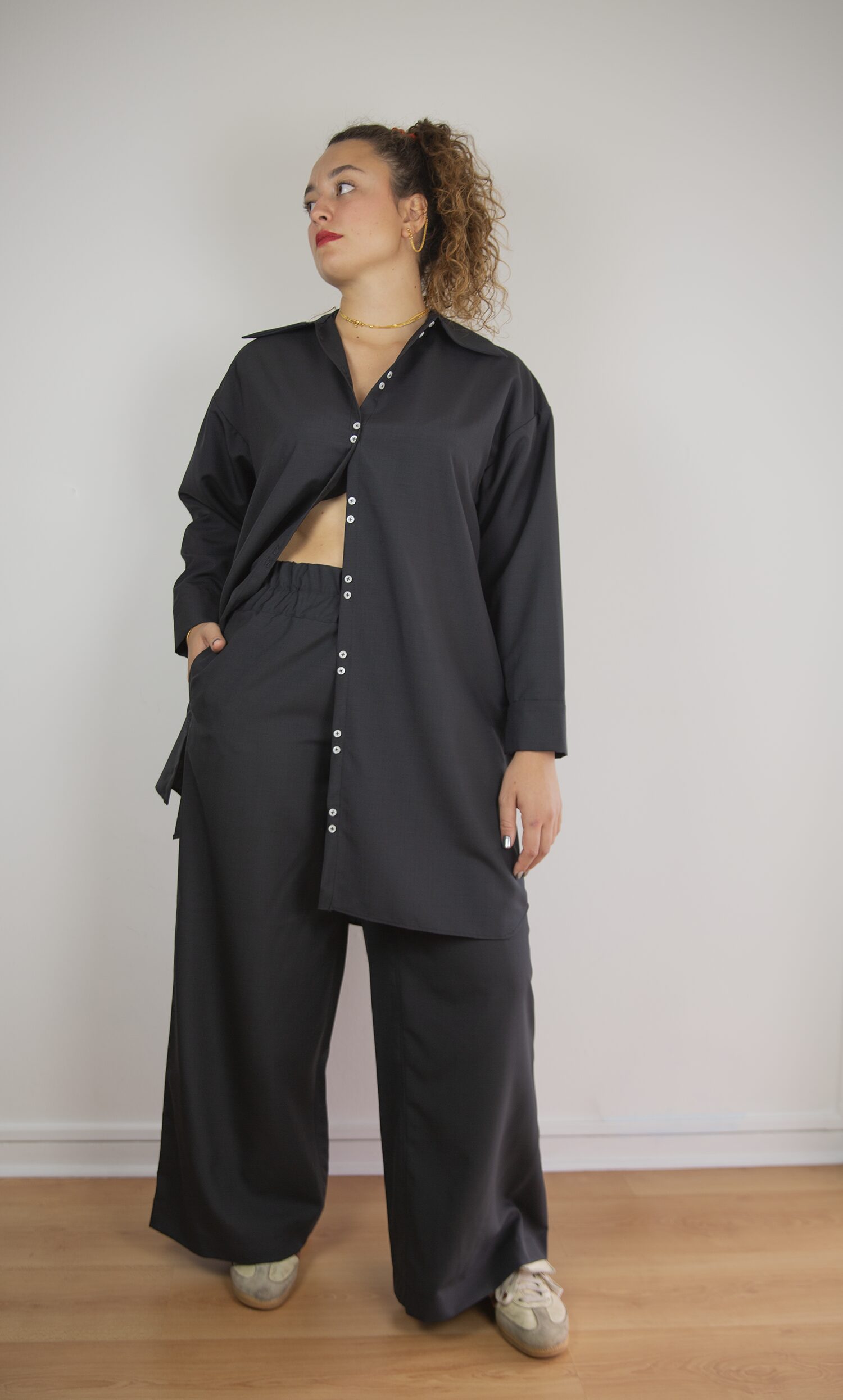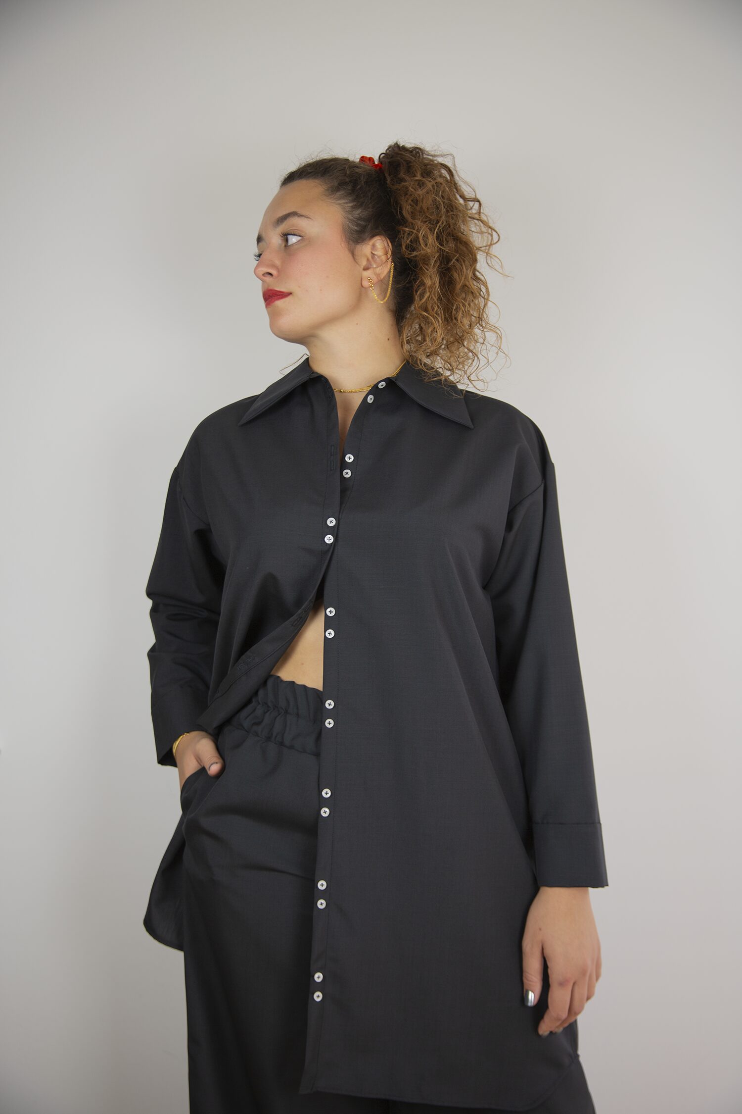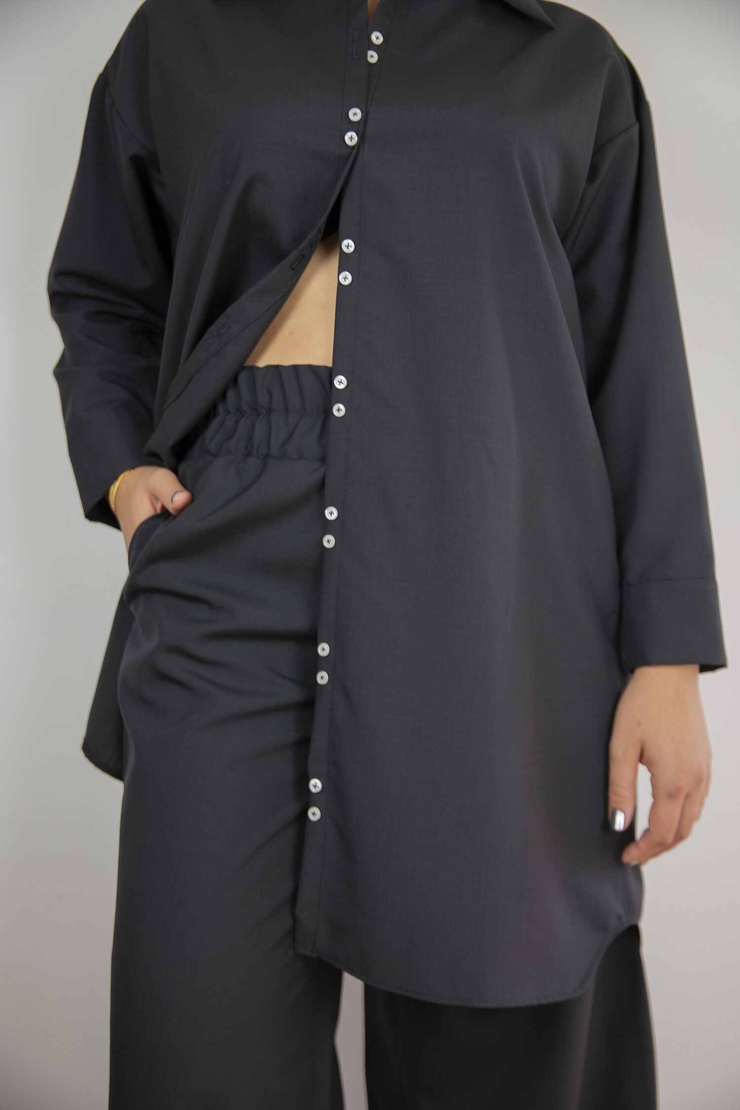 Déclinaison de la chemise Mies en version robe avec les détails iconiques GB, doubles boutons et poignets fendus. Elle conjugue volume large et non ajusté avec une allure quotidienne et élégante. Ses poches latérales pratiques se fondent dans la ligne. Une robe structurée, minimaliste et contemporaine. À porter fermée, ceinturée ou ouverte.